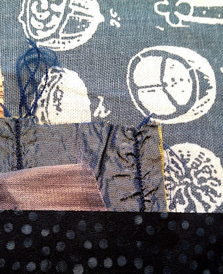 Today I played with some fragments that seemed happy together. A little fiber collage series, perhaps. But I feel a little stuck now. My sweetie put an old necktie in the discard pile, and it sat around for awhile until I decided to put in my stash because I love the birds on that black background (below). Then he decided he might wear it again, at just about the time I decided those birds would be perfect additions to my collages.